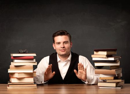 A young teacher in glasses sitting at classroom desk with pile of books in front of clean blackboard back to school concept.