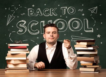 A young teacher in glasses sitting at classroom desk with pile of books in front of blackboard saying back to school drawing concept.