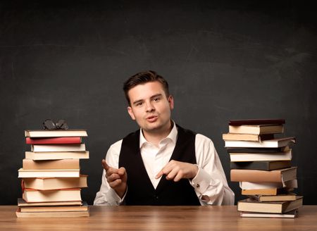 A young teacher in glasses sitting at classroom desk with pile of books in front of clean blackboard back to school concept.