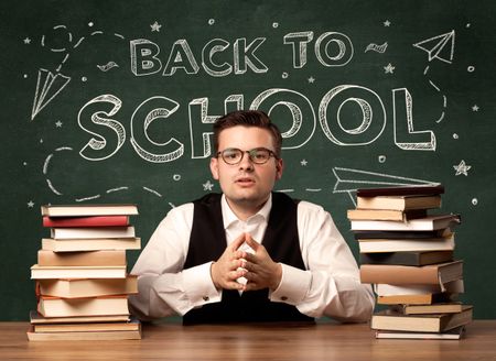 A young teacher in glasses sitting at classroom desk with pile of books in front of blackboard saying back to school drawing concept.