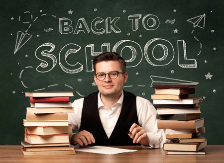 A young teacher in glasses sitting at classroom desk with pile of books in front of blackboard saying back to school drawing concept.