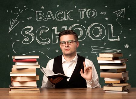 A young teacher in glasses sitting at classroom desk with pile of books in front of blackboard saying back to school drawing concept.
