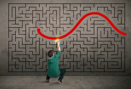 Young urban painter drawing a red solution line on the wall maze