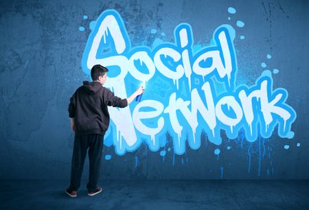 Young urban painter drawing a social network subtitle on the wall