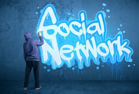 Young urban painter drawing a social network subtitle on the wall