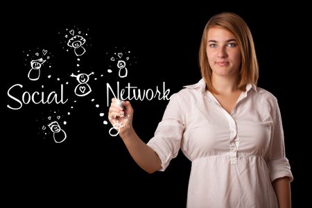 Young woman draving social network theme on whiteboard