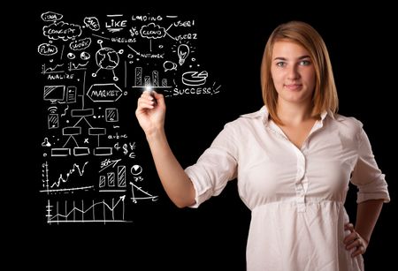 Young woman drawing business scheme and icons on whiteboard