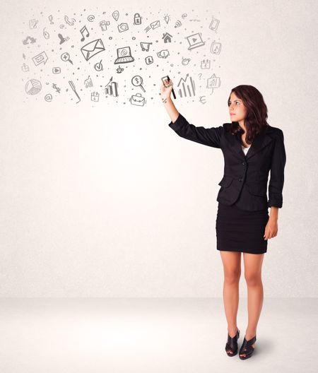 Young woman drawing and sketching icons and symbols on white background
