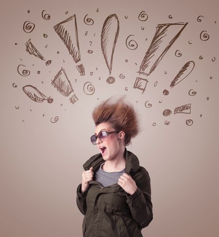 Young woman with hair style and hand drawn exclamation signs concept on background