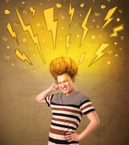 Young woman with hair style and hand drawn lightnings concept on background