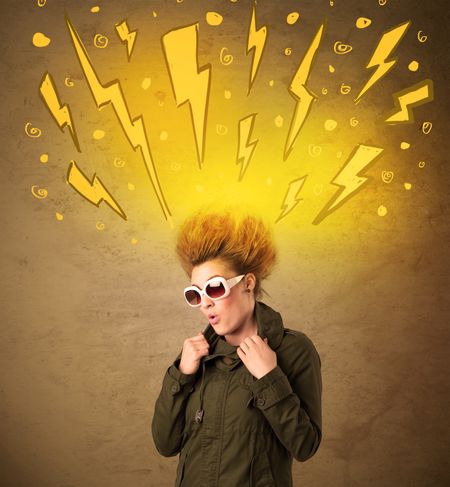 Young woman with hair style and hand drawn lightnings concept on background