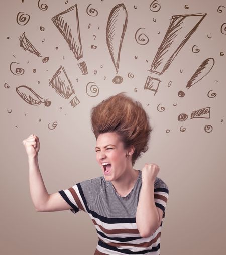 Young woman with hair style and hand drawn exclamation signs concept on background