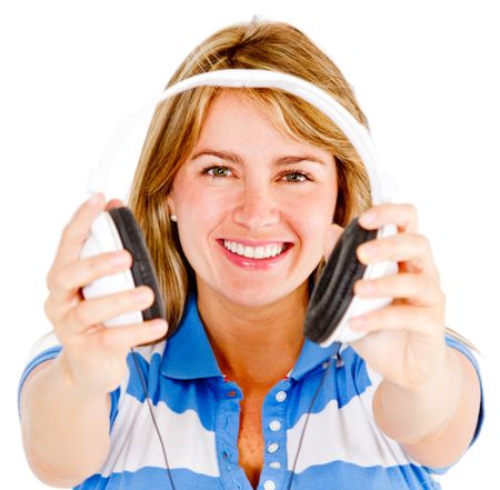 Young woman holding headphones - isolated over a white background