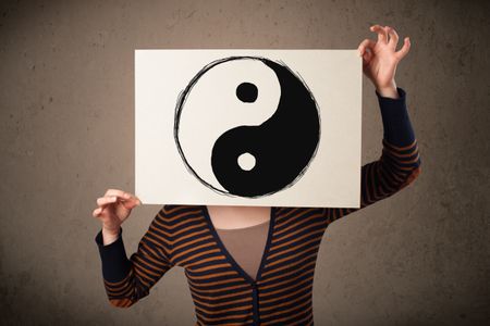 Young woman holding a paper with a yin-yang symbol on it in front of her head