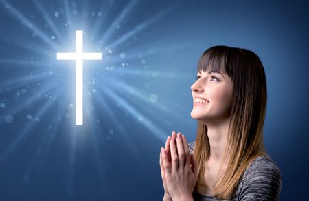 Young woman praying on a blue background with a sparkling cross above her