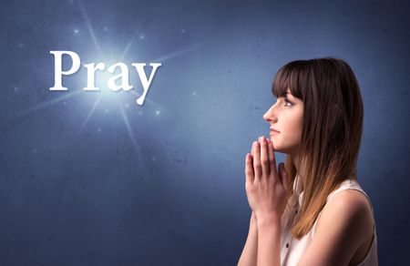Young woman praying on a blue background with the word Pray written above her