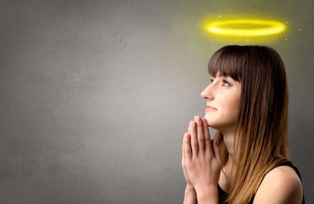 Young woman praying on a grey background with a shiny yellow halo above her head
