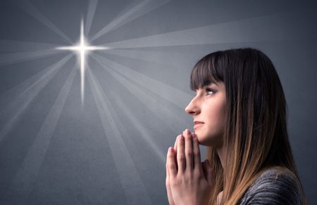 Young woman praying on a grey background with a shiny cross silhouette above her