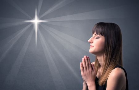 Young woman praying on a grey background with a shiny cross silhouette above her