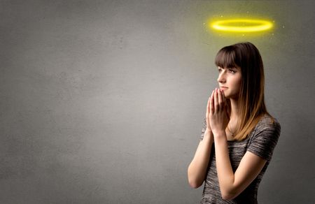 Young woman praying on a grey background with a shiny yellow halo above her head