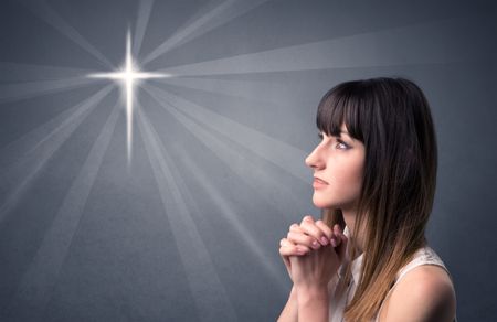 Young woman praying on a grey background with a shiny cross silhouette above her