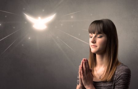 Young woman praying on a grey background with a sparkling bird above her