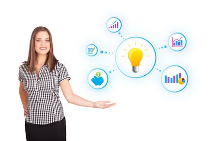 Young woman presenting light bulb with colorful graphs and diagrams isolated on white