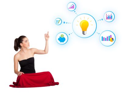 Young woman presenting light bulb with colorful graphs and diagrams isolated on white