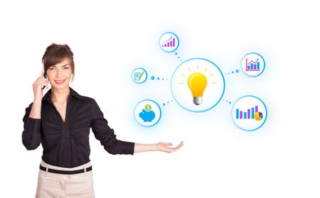 Young woman presenting light bulb with colorful graphs and diagrams isolated on white