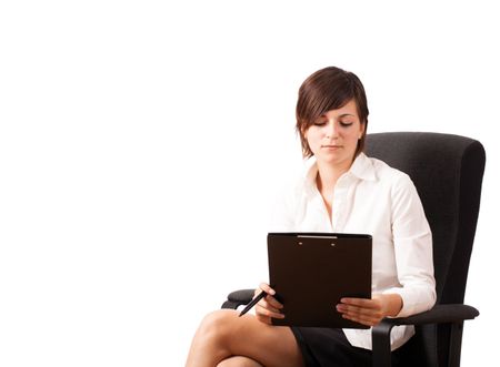 Young woman presenting on wihteboard with white copyspace isolated on white