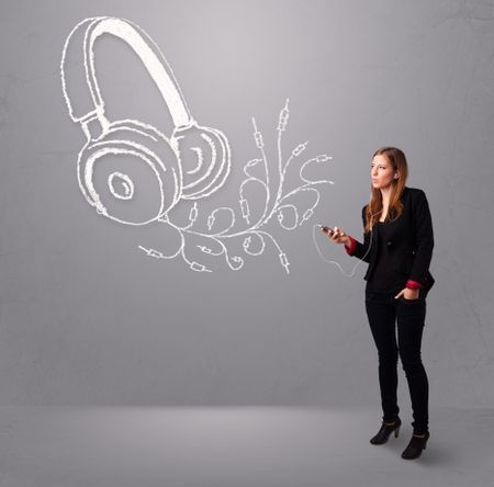 young woman singing and listening to music with abstract headphone getting out of her mouth