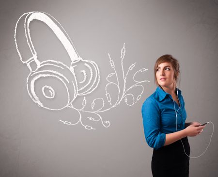young woman singing and listening to music with abstract headphone getting out of her mouth