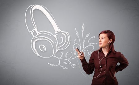 young woman singing and listening to music with abstract headphone getting out of her mouth