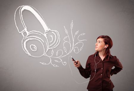 young woman singing and listening to music with abstract headphone getting out of her mouth