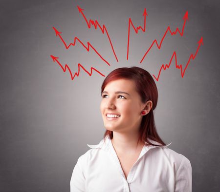 Young woman standing and thinking with arrows overhead