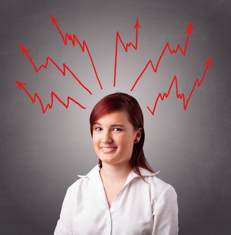 Young woman standing and thinking with arrows overhead