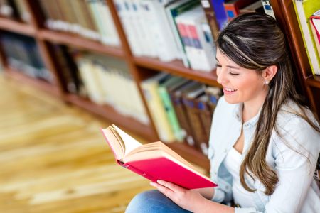 Young woman studying at the library reading a book