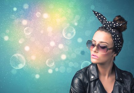 Young woman with sunglasses and bokeh colourful lights concept