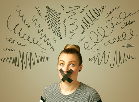 Young woman with taped mouth and curly lines around her head