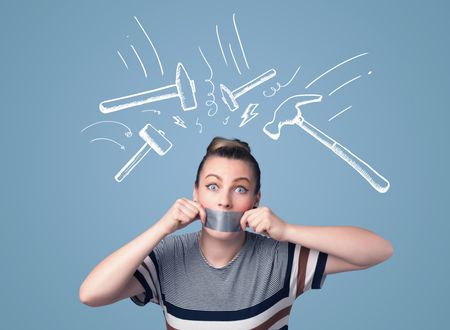 Young woman with taped mouth and white drawn beating hammer marks around her head