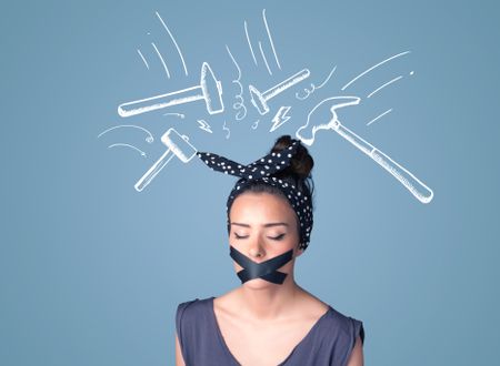 Young woman with taped mouth and white drawn beating hammer marks around her head