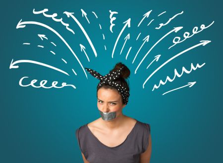 Young woman with taped mouth and white drawn lines and arrows around her head