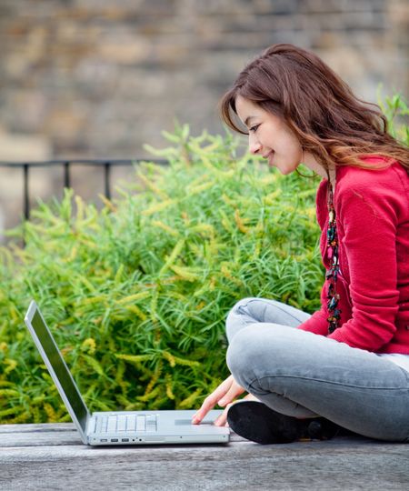 Young woman working on a laptop computer outdoors