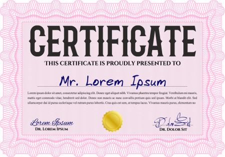 Awesome Certificate template. Award. Money Pattern. With great quality guilloche pattern. Pink color.