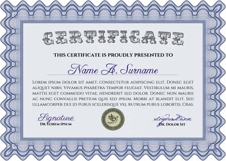 Blue Certificate of achievement. Diploma of completion. Sophisticated design. With guilloche pattern and background.