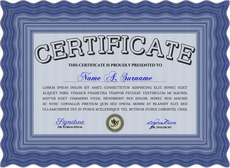 Blue Certificate of achievement template. With guilloche pattern and background. Money design. Diploma of completion.