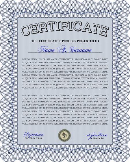 Blue Certificate of achievement template. With guilloche pattern. Money design. Design template.