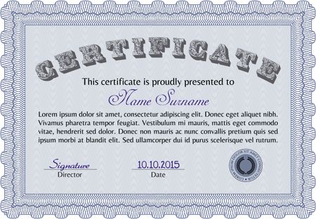 Blue Certificate of achievement template. With guilloche pattern and background. Money design. Diploma of completion.