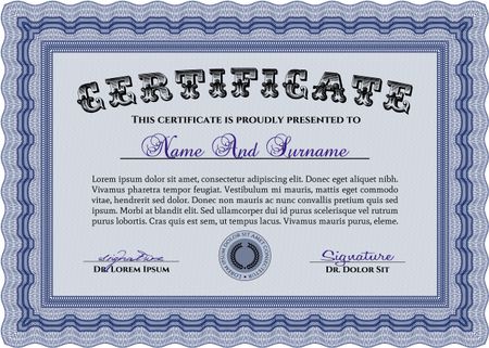 Blue Certificate or diploma template. Customizable, Easy to edit and change colors. Easy to print. Cordial design.