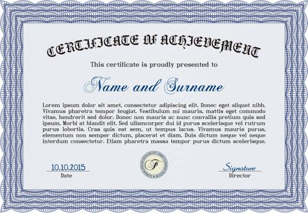 Blue Certificatem diplmoa or award template. Money style design. Design template. With guilloche pattern.